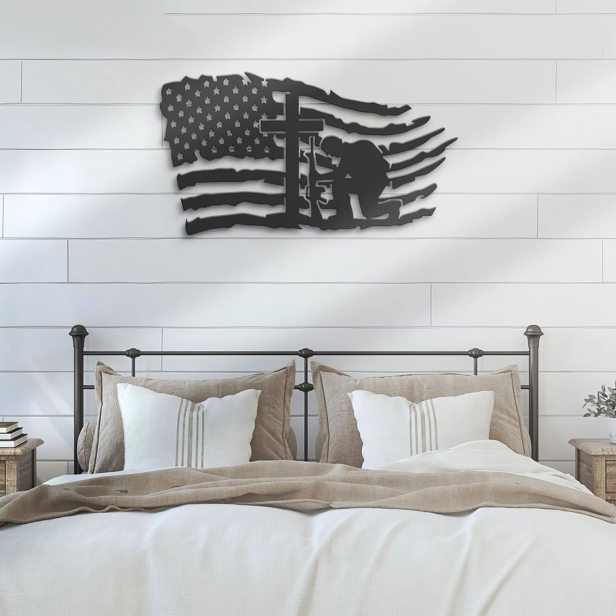 Premium US Veteran Metal Signs VPVC901165, Gifts For US Veteran, US Soldier Kneeling Praying At Memorial Cross Metal Wall Art USA Fallen Soldier Sign Veteran Patriotic Decor